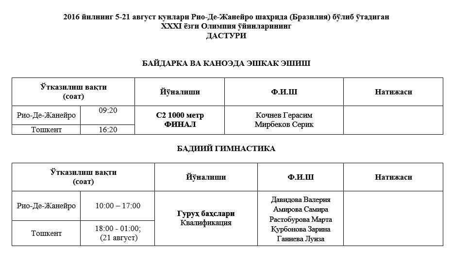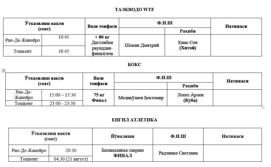 Bugun, 20 avgust, XXXI yozgi olimpiya o‘yinlarida o‘n beshinchi kun. Milliy olimpiya qo‘mitasi Braziliyada bo‘lib o‘tayotgan Olimpiya o‘yinlarining 20 avgustdagi chiqishlari jadvalini e'lon qildi.