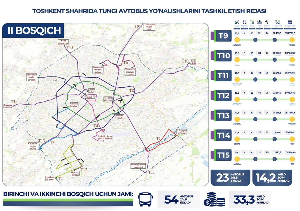 Ikkinchi bosqichda esa 7 ta yo‘nalish bo‘lib, umumiy 98 kilometrlik yo‘ldan o‘tadi. 23 ta avtobus jalb etiladigan bu bosqich uchun 14,2 mlrd so‘m sarflanishi reja qilingan. Yo‘nalishlar: