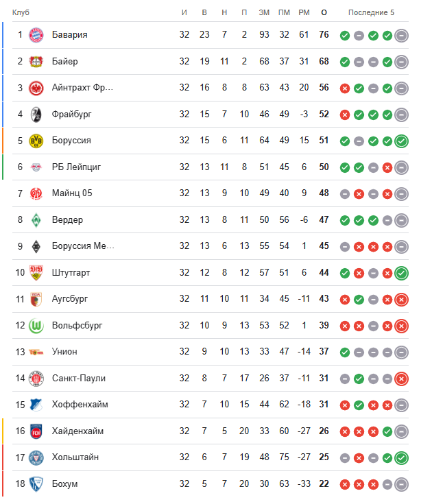 «Bavariya» futbolchilari maydonda bo‘lmay turib 34-titulga ega chiqishdi va keyingi turda Kumush tovoqni qabul qilib olishadi. Beshinchi o‘ringa tushgan «Borussiya» YeChL zonasidan atigi bir ochkoga ortda qolmoqda. Dortmundliklar keyingi turda mavsum uchun motivatsiyasi qolmagan «Bayyer»ga qarshi Leverkuzenda o‘ynaydi.