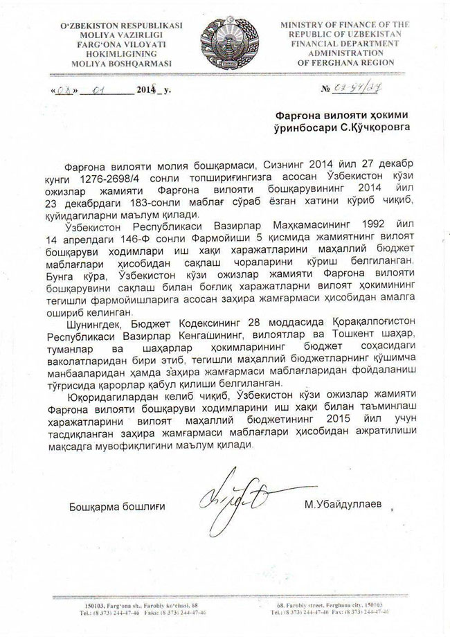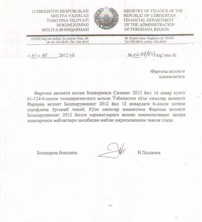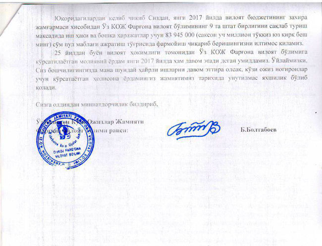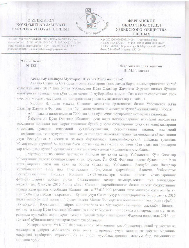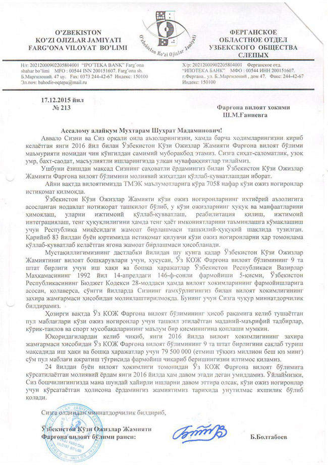 “Davlatimiz rahbari tomonidan 2017 yil “Xalq bilan muloqot va inson manfaatlari yili”, deb e'lon qilinishi yurtdoshlarimiz uchun katta huquq va erkinliklar berdi. Ammo ayrim hududlardagi rahbarlar hozirgi kunda ham murojaatlarni e'tiborsiz qoldirayotganligi achinarli. Viloyat hokimi bilan uchrashish va moliyaviy muammolarni ijobiy hal etish uchun sa'y-harakatlarimizni 2017 yilda ham davom ettirmoqdamiz. Jumladan, joriy yilning 7 fevral kuni 1088 ishonch telefoniga qilgan murojaatimiz hozircha javobsiz qolmoqda. 15 fevral kuni viloyat hokimi birinchi o‘rinbosari S.B.Qo‘chqorovga yuborgan yozma murojaatimizda ham shaxsiy qabuliga kirish masalasida amaliy yordam so‘ralgan. Bu murojaatimizni ham javobi kutilmoqda”, deb yozadi O‘zbekiston “Ko‘zi ojizlar” jamiyati Farg‘ona viloyat bo‘limi raisi B.Boltaboyev.