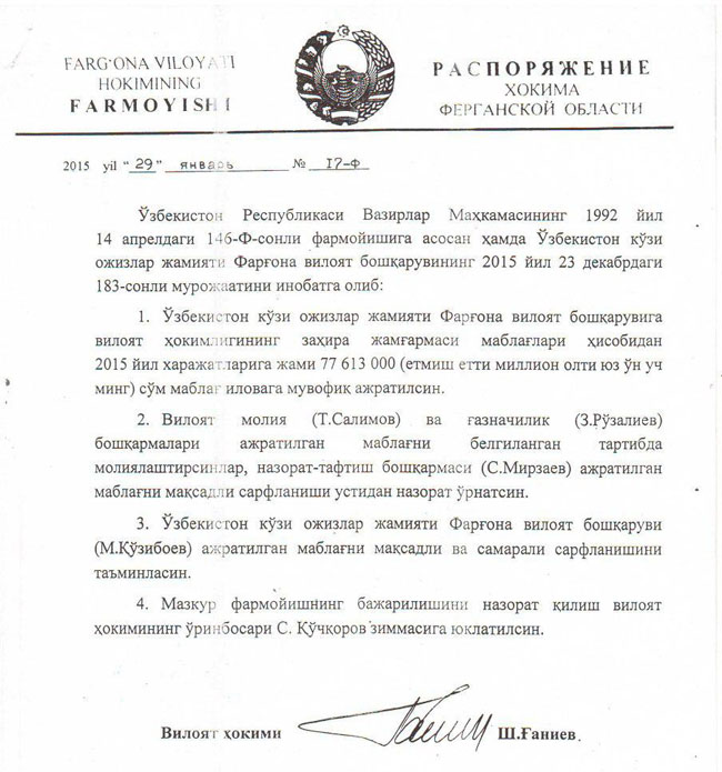 O‘z KOJ Farg‘ona viloyat bo‘limiga shu vaqtga qadar ko‘rsatilgan moliyaviy yordamni ushbu jamiyatga 2017 yilda ham davom ettiradi, deb umid qilamiz. Zero, O‘zbekiston Respublikasida istiqomat qiluvchi barcha fuqaro dinidan, millatidan, irqidan, e'tiqodidan, ijtimoiy holatidan qat'i nazar davlat himoyasidadir. Jamiyatni yagona huquq, yagona mafkuragina birlashtirib turadi. O‘zbekistonda hech kim nazardan chetda emas, barcha teng huquqli va o‘z huquqini talab qilishga haqlidir.