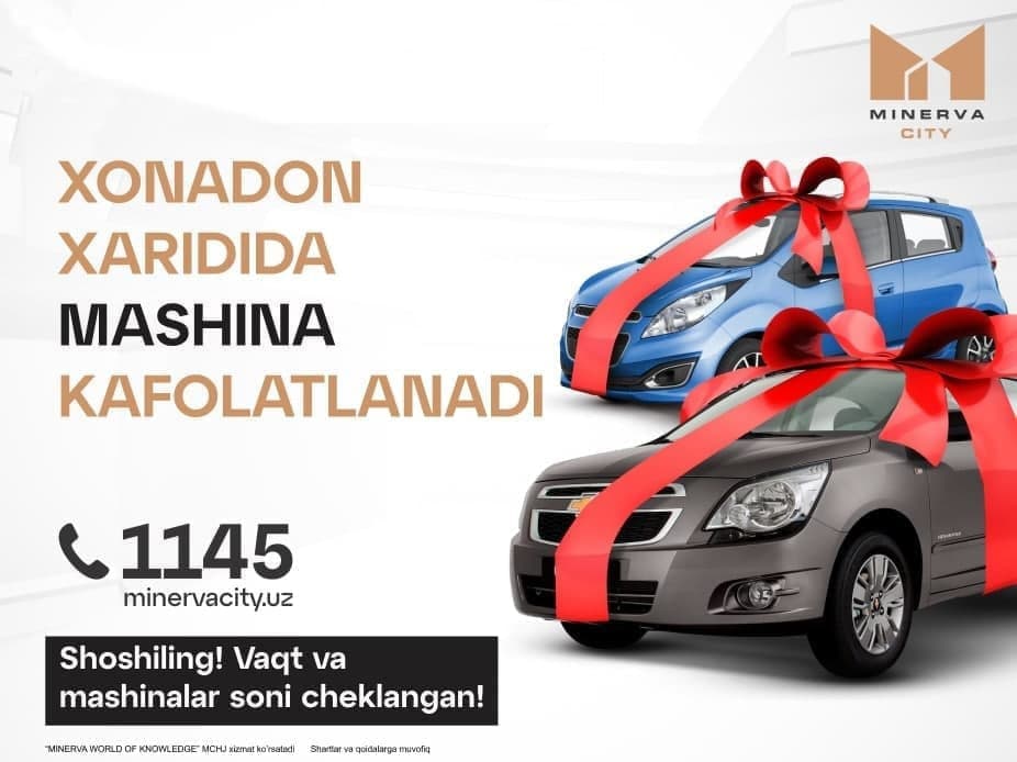 Minerva City “Bitta o‘rniga ikkita” aksiyasini sizlarga taqdim etishdan bag‘oyat xursand, siz bu aksiyaga ko‘ra majmuadan 3 xonali xonadon xarid qilishingiz va kafolatlangan avtomobilga ega bo‘lishingiz mumkin! Tiplashgan 3 xonali xonadonni tanlab, Spark yoki Cobalt rusumli avtomobilini sovg‘aga olasiz!