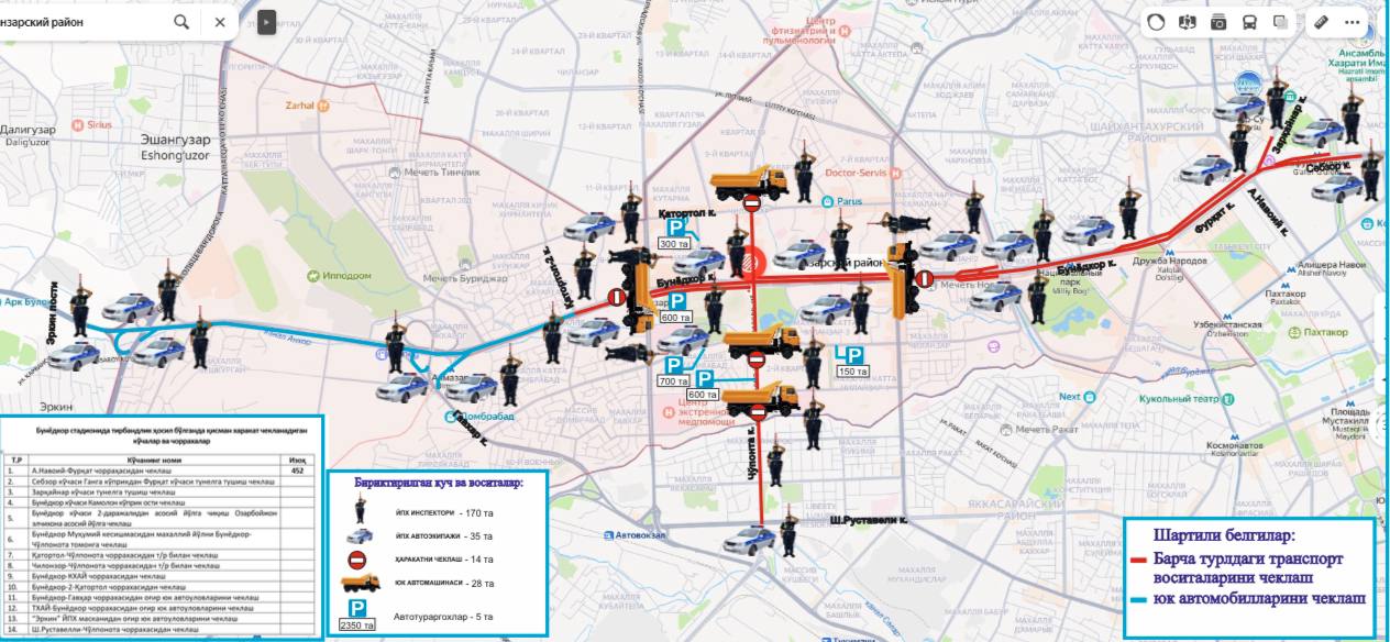 Poytaxt IIBB YHXB xabariga ko‘ra, shu munosabat bilan Chilonzor tumanining ayrim ko‘chalarida soat 12:00 dan 23:00 ga qadar bo‘lgan vaqt oralig‘ida avtotransport vositalari harakati to‘liq cheklanadi.