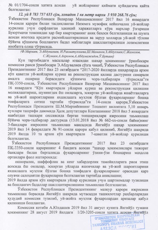 «Ommaviy axborot vositalarida yoritilganidan so‘ng, tuman hokimi va boshqa mutasaddilari uyimizga kelishdi. Bizga Yangiyo‘l tumanidan 3 xonali namunali uylardan tavsiya qilishdi. Biz rozi bo‘lgandik. Biroq viloyat hokimligidan kelishganda prezident yangi massivdan sovg‘a qilgani sababli shu uyni berishdi. Biz oldin ham aytganimdek, qayerdan bersa ham «shu prezident sovg‘asi» desin, olaverishimizni aytdim. 1 sentabr kuni shahar hokimiyatidan chaqirishdi, onamga kalitlarni berishdi. Yangiyo‘l shahri hokimiyatidan qaror chiqarib berishdi», deydi u.