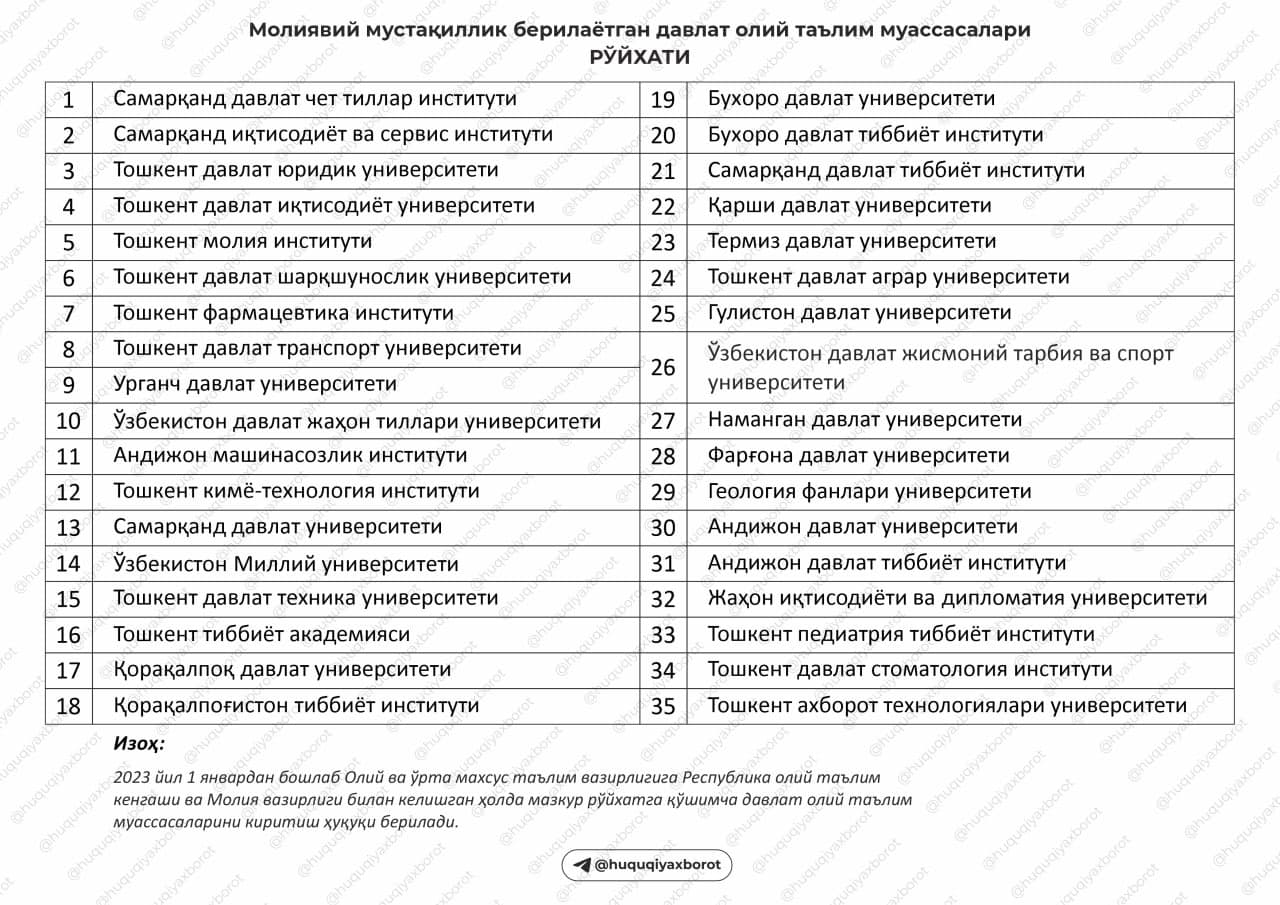 Adliya vazirligi xabariga ko‘ra, qaror bilan moliyaviy mustaqillik berilayotgan davlat OTM ro‘yxati (35 ta) tasdiqlandi.