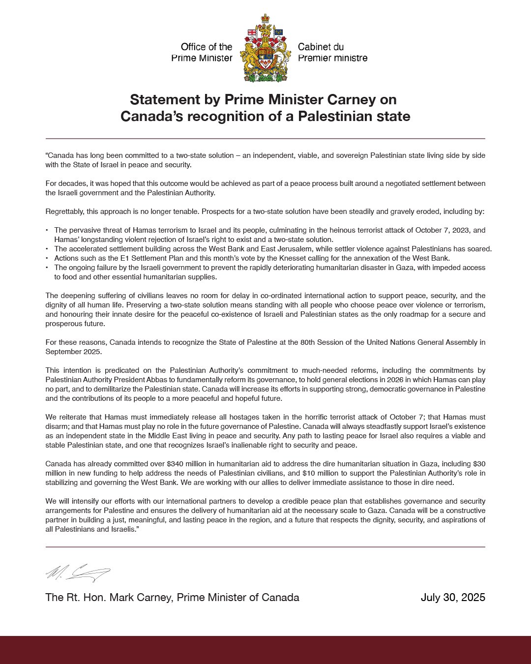 30 iyul kuni Kanada bosh vaziri Mark Karni mamlakat Birlashgan Millatlar Tashkilotining sentabr oyidagi yig‘ilishida Falastin davlatini tan olish rejasini ma’lum qildi. G‘azoda ocharchilik kuchayib borayotgan paytda amalga oshirilgan bu qadamlar Isroilga nisbatan bosimni oshirmoqda.