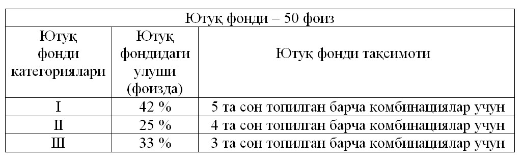 Yangi qoidalar lotereyaning 319-sonli tirajidan boshlab joriy etiladi va o‘yin biletlarini ro‘yxatdan o‘tkazilishidan hosil bo‘lgan yutuq fondining 42 foizi 1-kategoriyadagi yutuqlarni to‘lash uchun, 25 foizi 2-kategoriyadagi yutuqlarni va nihoyat, 33 foizi esa 3-kategoriyadagi yutuqlarni to‘lash uchun yo‘naltiriladi.
