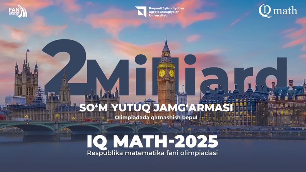 O‘zbekistonda matematika fani bo‘yicha IQMath-2025 olimpiadasiga ro‘yxatdan o‘tish boshlandi. Bu nufuzli tanlov Raqamli iqtisodiyot va agrotexnologiyalar universiteti (UDEA) hamda Ixtisoslashtirilgan ta’lim muassasalari agentligi huzuridagi Fan olimpiadalari markazi hamkorligida tashkil etilib, sovrin jamg‘armasi 2 milliard so‘mni tashkil etadi va eng iqtidorli yoshlarni aniqlash hamda ularni rag‘batlantirishga qaratilgan.