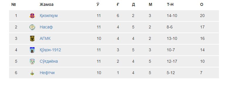 Endilikda «Qizilqum» qolish uchun kurashuvchilar guruhida 20 ochko bilan birinchi o‘rinda, «Nasaf» 17 ochko bilan ikkinchi, «Qo‘qon-1912» 14 ochko bilan to‘rtinchi, «So‘g‘diyona» esa 10 ochko bilan beshinchi o‘rinda joylashgan.