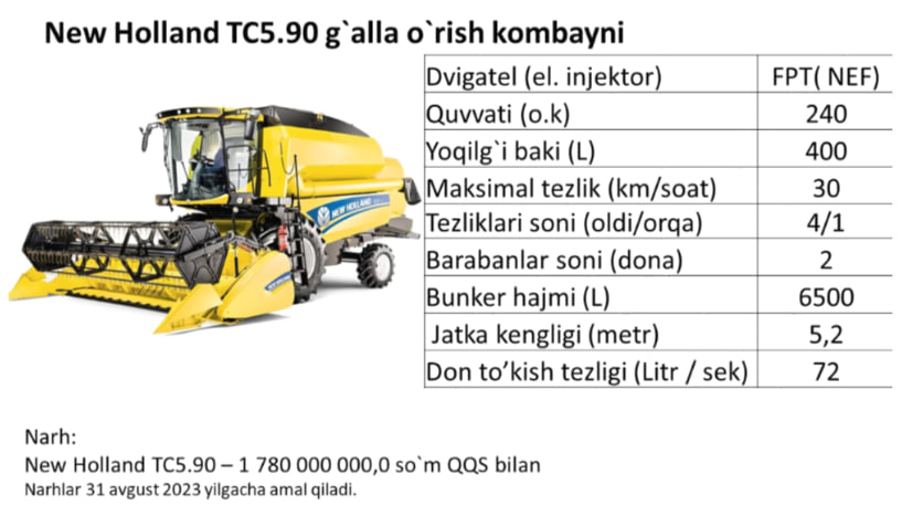 Xususan, mintaqa iqlim sharoitlaridan kelib chiqib o‘zini mijoz maydonlarida ijobiy tomondan ko‘rsatgan Case AF4088 hamda New Holland TC5.90 g‘alla o‘rish kombaynlarini misol keltiramiz.