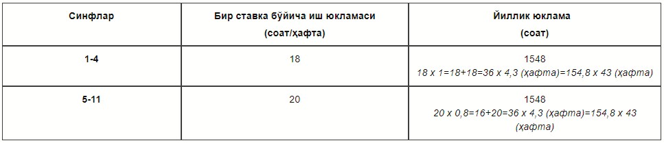 Norma’ning yozishicha, maktab pedagogining ish rejasi uning yillik ish yuklamasidan iborat (43 hafta, haftalik 36 soat, kunlik 6 soat). Yillik yuklama 1 yoki 0,8 koeffitsiyentga (sinflarga bog‘liq holda) ko‘paytirilgan bir stavka miqdoridagi ish yuklamasi hajmidan kelib chiqib hisoblanadi.