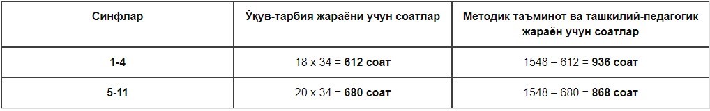 O‘quv-tarbiya soatlarini hisoblash uchun bir yil mobaynida dars mashg‘ulotlari olib boriladigan haftalar soniga ko‘paytirilgan bir stavka miqdoridagi ish yuklamasi haftalik hajmi olinadi. Qolgan vaqtdan ikkinchi jarayon uchun foydalaniladi.