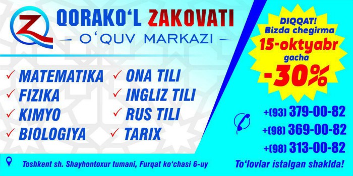 "Qorako'l zakovati" o‘quv markazida 15 oktabrga qadar barcha fanlarni o‘qitish uchun 30 foizlik chegirma e'lon qilingan. Bundan tashqari, kam ta'minlangan oilalarga 100%gacha chegirmalar mavjud! Shunday ekan, bunday imkoniyatdan foydalanib qoling!