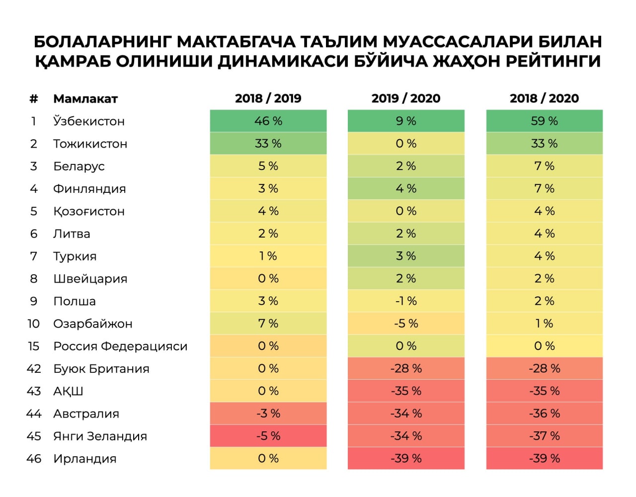 O‘zbekistondan tashqari, birinchi o‘ntalikka Tojikiston (+33%), Belarus (+7%), Finlandiya (+7%), Qozog‘iston (+4%), Litva (+4%), Turkiya (+4%), Shveytsariya (+2%), Polsha (+2%) va Ozarboyjon (+1%) kirdi. Reytingdagi mamlakatlarning yarmidan ko‘prog‘ida 2018-2020 yillarda bolalarni maktabgacha ta’lim muassasalariga qamrab olish darajasi pasaygan.