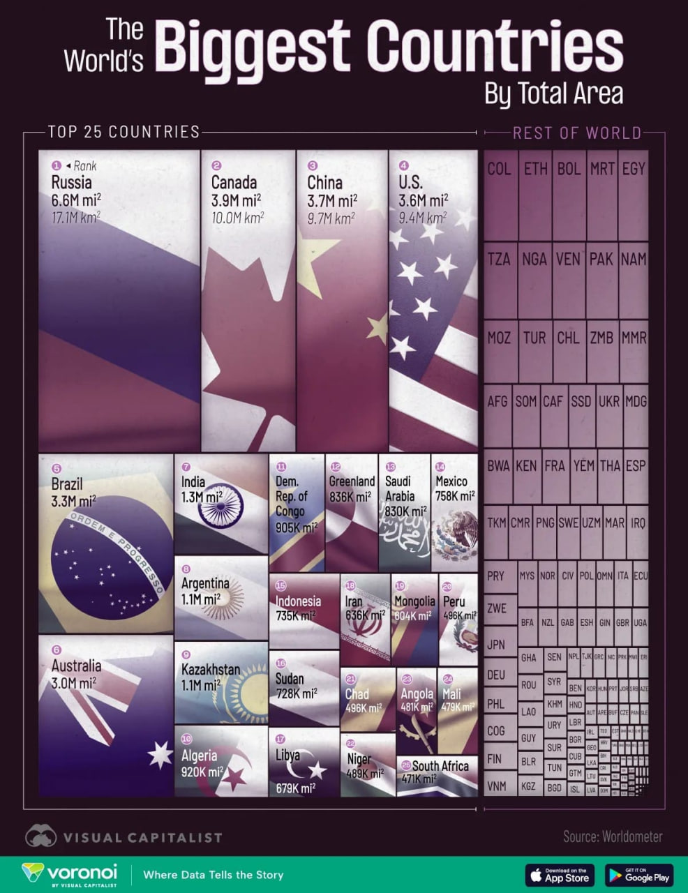 Visualcapitalist portali mutaxassislari tomonidan yaratilgan yangi vizualizatsiyada har bir mamlakat o‘zining quruqlikdagi maydoni va ichki suv havzalari (ko‘llar, suv omborlari, daryolar) yig‘indisi sifatida hisoblangan umumiy maydoni bo‘yicha tartiblangan.