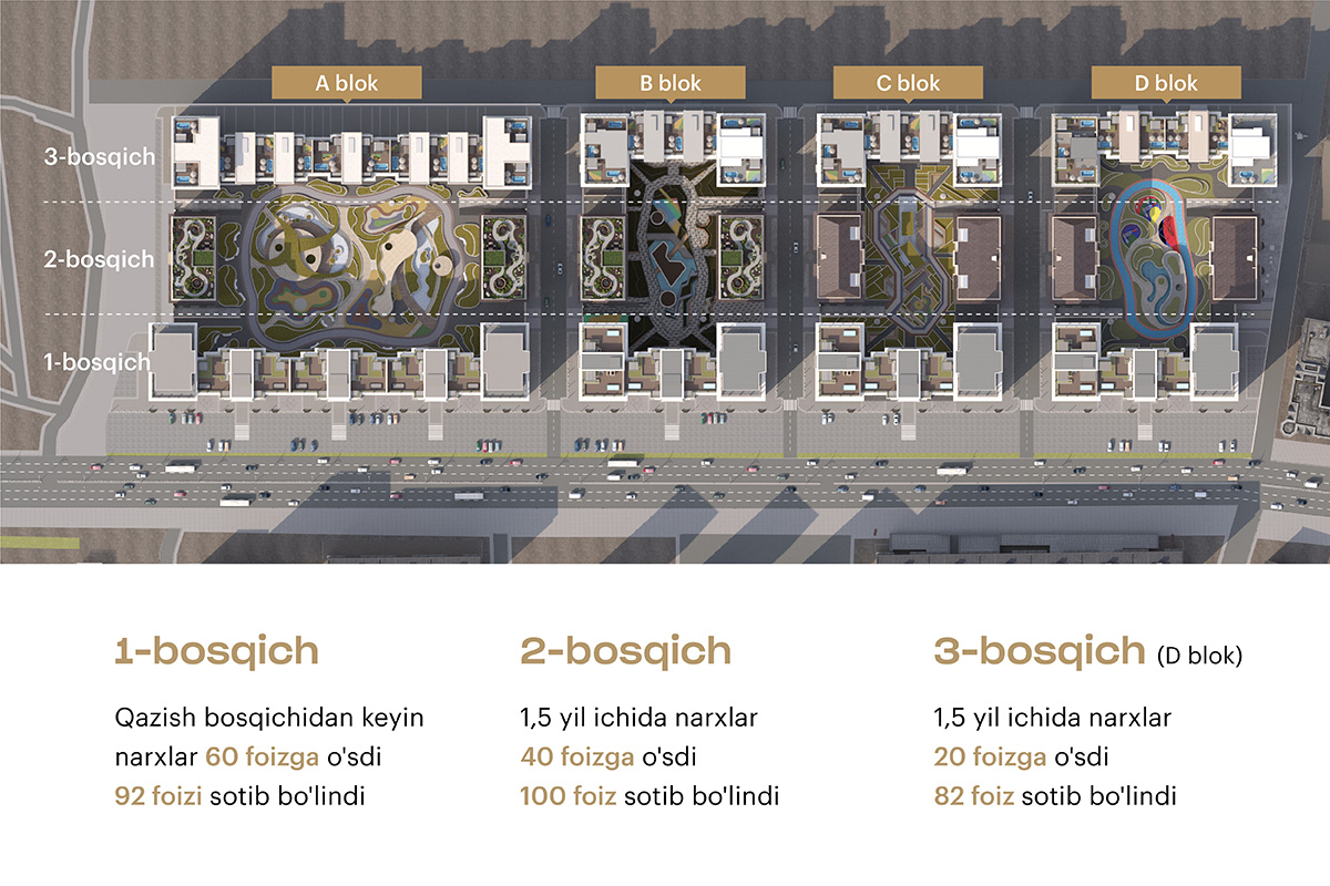 Mirabad Avenue rezidensiyasining birinchi bosqichidagi xonadonlar 92 foizga, ikkinchi bosqichda – 100 foizga, «D» blokining uchinchi bosqichida – 82 foizga sotildi. 20 iyun kuni rezidensiya uchinchi bosqichda yangi xonadonlarning uzoq kutilgan sotuvini e’lon qildi. Sotib olish mumkin bo‘lgan xonadonlar «A» blokining uchinchi bosqichida maydoni 120 sotix bo‘lgan eng katta hovli bog‘i, shuningdek, «B» blokida 45 sotix maydonli shaxsiy hovlisi bor. Qazish bosqichida yuqori darajadagi ko‘chmas mulkni sotib olishga va foydali sarmoya kiritishga ulguring.
