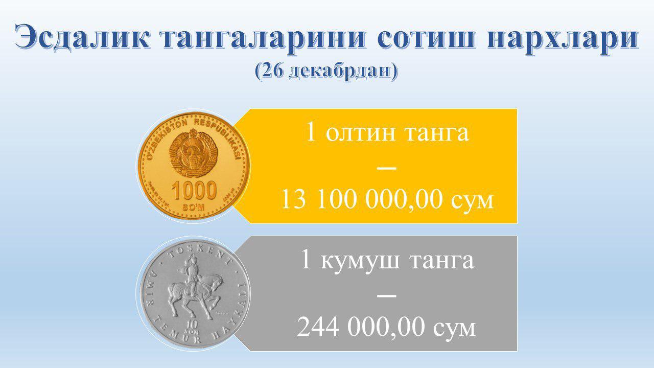 Shu tariqa, bugundan boshlab oltin tangalar narxi 200 ming so‘mga, kumush tangalar 1 ming so‘mga oshgan.