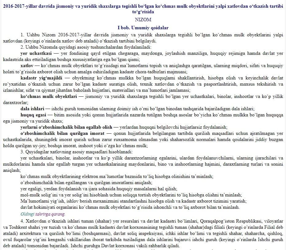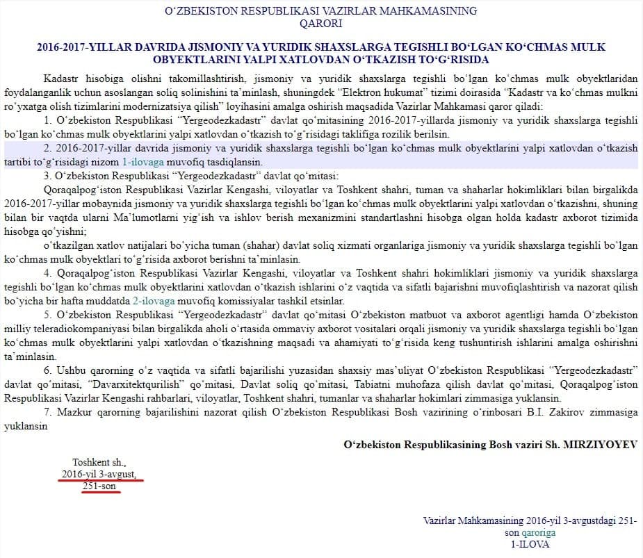 U Vazirlar Mahkamasining 251-sonli qaroriga muvofiq korxonasiga tegishli obektlarni yalpi xatlovdan o‘tkazishda hokimlik huquqshunosi Nodir Mirzaqulovdan yordam so‘ragani katta xatosi bo‘lganini ta'kidlaydi.