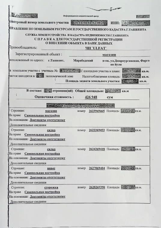 Mirobod tumani hokimining qurilish bo‘yicha o‘rinbosari Farhod Najmiddinovning aytishicha, tadbirkorga Toshkent shahar hokimining 1995 yil 17 yanvardagi farmoyishiga asosan buzilgan oziq-ovqat do‘koni o‘rniga oziq-ovqat do‘koni va mahalla guzari qurilishi uchun 8 sotix yer ajratilgan, biroq do‘kon hokimlik tomonidan ajratilgan joyda qurilmagan.