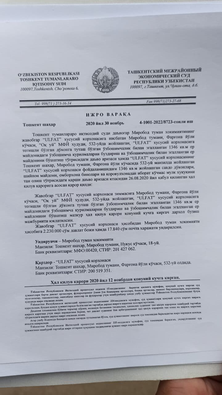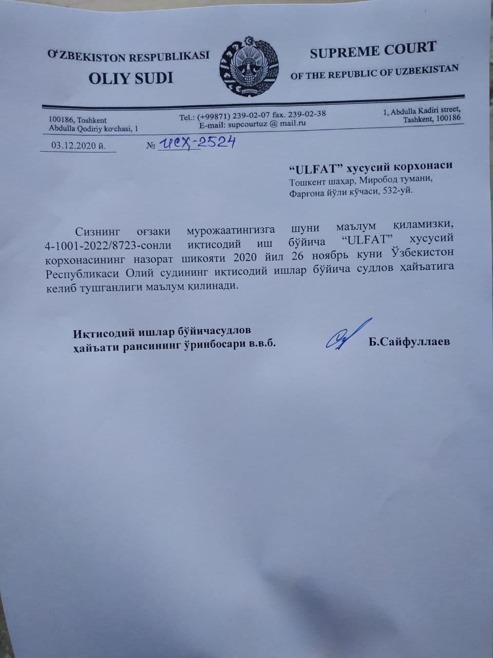 Uning so‘zlariga ko‘ra, Oliy sudning iqtisodiy ishlar bo‘yicha sudlov hay'ati raisi o‘rinbosari B.Sayfullayev imzosi bilan «Ulfat» xususiy korxonasining nazorat shikoyati Oliy sudga kelib tushgani haqidagi rasmiy xatini tuman hokimligi va MIB ijrochilariga taqdim etgan. Biroq ular ijro harakatlarini to‘xtatishmagan – bino va inshootlar buzib tashlangan.