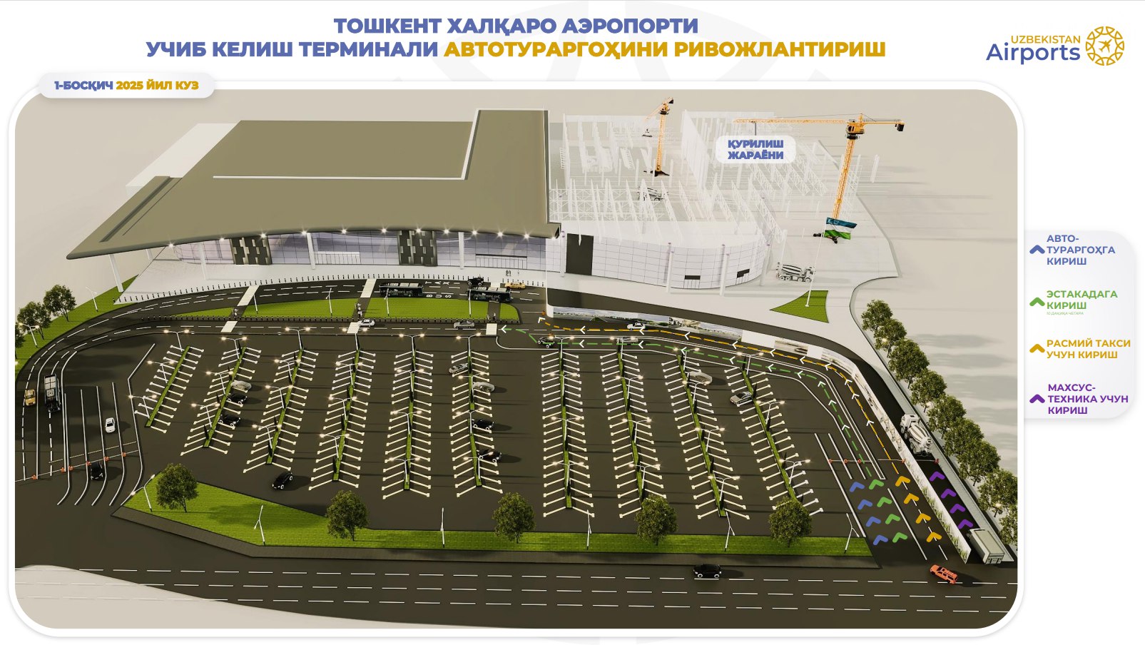 Birinchi qator faqat turistik avtobuslar va aeroportning rasmiy taksilari, ikkinchisi esa boshqalar uchun bo‘ladi. Terminal yaqinidagi avtoturargoh sig‘imi kengayadi.