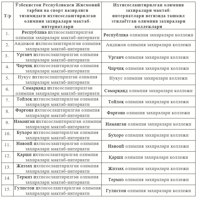 Muhokama uchun e'lon qilingan hujjat loyihasiga ko‘ra, Jismoniy tarbiya va sport vazirligi tizimidagi ixtisoslashtirilgan olimpiya zaxiralari maktab-internatlari negizida olimpiya zaxiralari kollejlari tashkil etiladi va 2020/2021 o‘quv yilidan faoliyati yo‘lga qo‘yiladi.