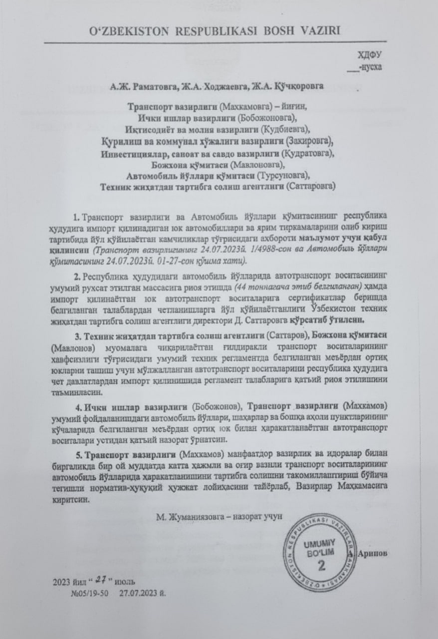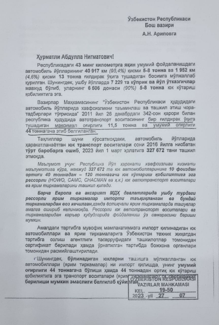 Transport vaziri va avtomobil yo‘llari qo‘mitasi raisining xatidan so‘ng tegishli tashkilotlarga bosh vazir topshirig‘i chiqarilgan. Jumladan, Ichki ishlar vazirligi va Transport vazirligiga umumiy foydalanishdagi avtomobil yo‘llari, shaharlar va boshqa aholi punktlarining ko‘chalarida belgilangan me’yordan ortiq yuk bilan harakatlanayotgan avtotransport vositalari ustidan qat’iy nazorat o‘rnatish topshirilgan.