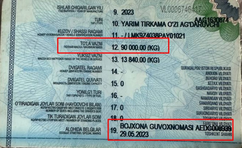 Ammo negadir ruxsat berilgan umumiy og‘irlik 44 tonnagacha qilib belgilangan bo‘lsa-da, respublikaga 80-90 tonnagacha yuk ko‘tara oladigan transport vositalari import qilingan, ularga sertifikat berilgan, bojxonada rasmiylashtirilgan, YHXXda ro‘yxatga olingan. Bu yuk mashinalari yarim tirkamalarining “texpasporti”da sof yuk ko‘tarish vazni 70-90 tonna ekani ochiq-oydin ko‘rsatib qo‘yilgan.