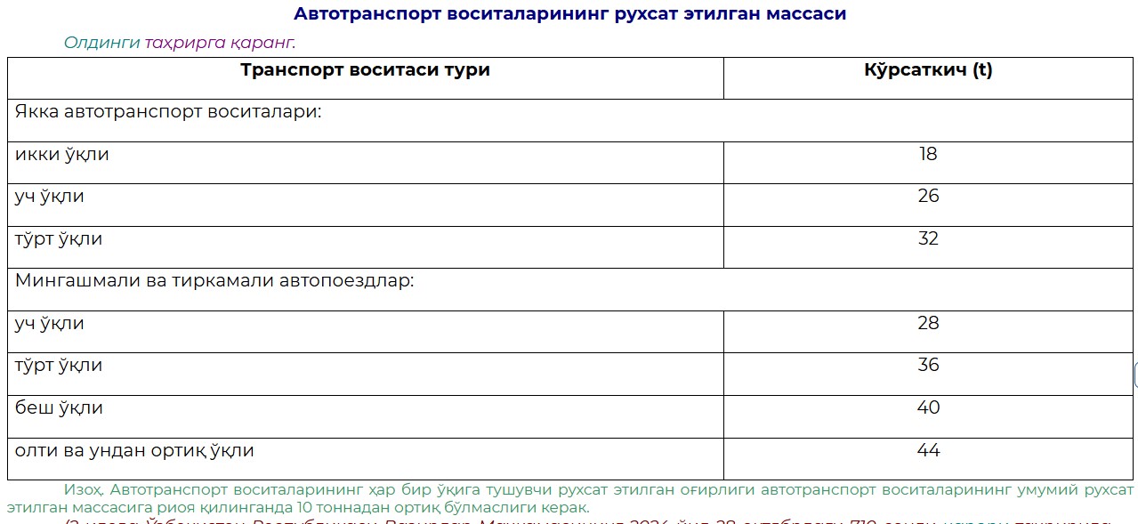 Bu qoidalarning 2-ilovasida avtotransport vositalarining ruxsat etilgan massasi keltirilgan. Unga ko‘ra, avtotransport vositalarining har bir o‘qiga tushuvchi ruxsat etilgan og‘irligi avtotransport vositalarining umumiy ruxsat etilgan massasiga rioya qilinganda 10 tonnadan ortiq bo‘lmasligi kerak. Ya’ni transport vositasi va undagi yukning umumiy og‘irligi 44 tonnagacha qilib belgilangan.