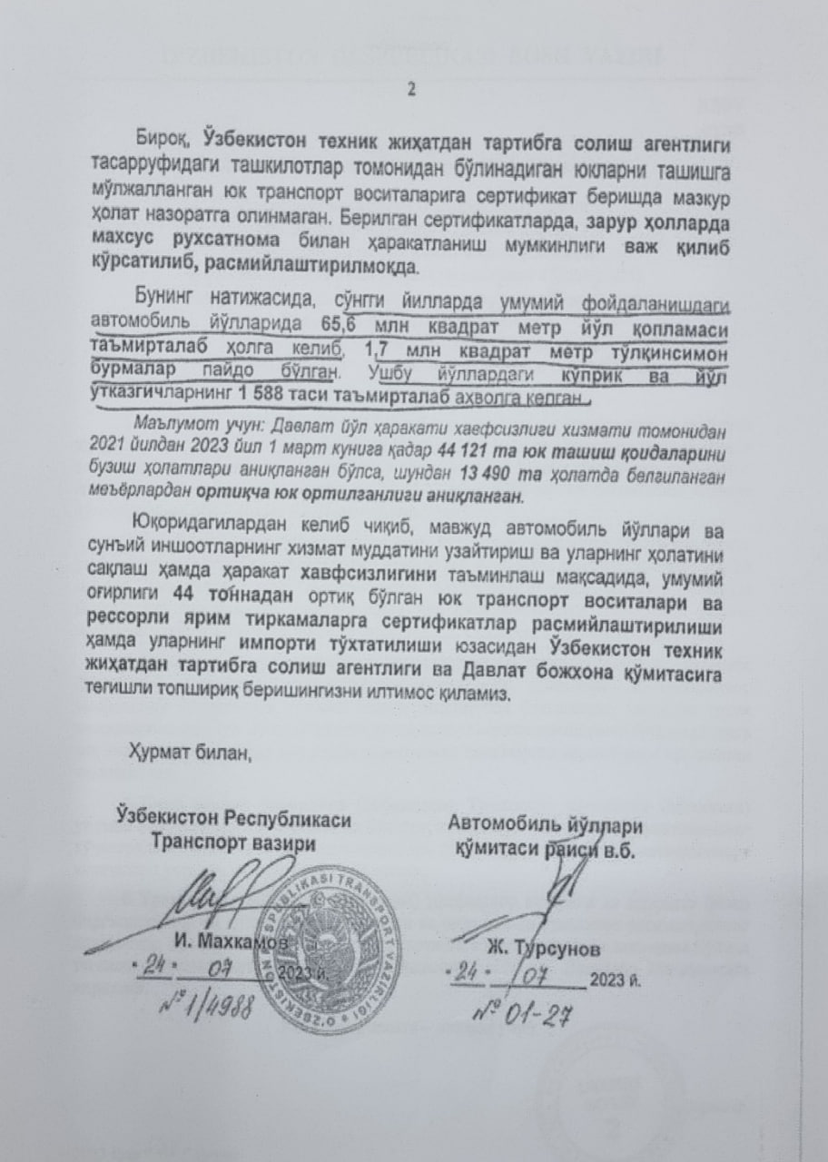 Vazir va qo‘mita raisi bu turdagi yuk mashinalari umumiy foydalanishdagi yo‘llar hamda ko‘priklarni buzayotganini ta’kidlab, bosh vazirdan ularning importini to‘xtatishni so‘ragan.