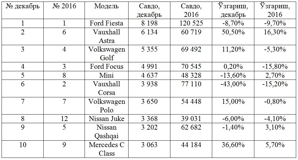 Ford, Opel va Volkswagen Britaniya avtobozorida eng ommabop brendlar nomini saqlab qoldi. Shu bilan birga ulardan har birining savdosi 5,1 foizdan 7,5 foizgacha tushib ketgan. Quyida Buyuk Britaniya avtobozorida 2016 yilda "bozori chaqqon" bo‘lgan mashinalar ro‘yxati keltirilgan.