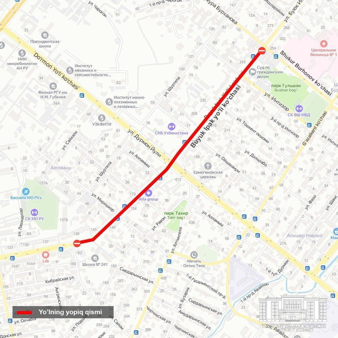 Toshkent shahrining Mirzo Ulug‘bek tumanidagi Buyuk Ipak Yo‘li ko‘chasining Shukur Burxonov ko‘chasidan Salom ko‘chasigacha bo‘lgan qismida yo‘lning bir tomoni qisman yopiladi.