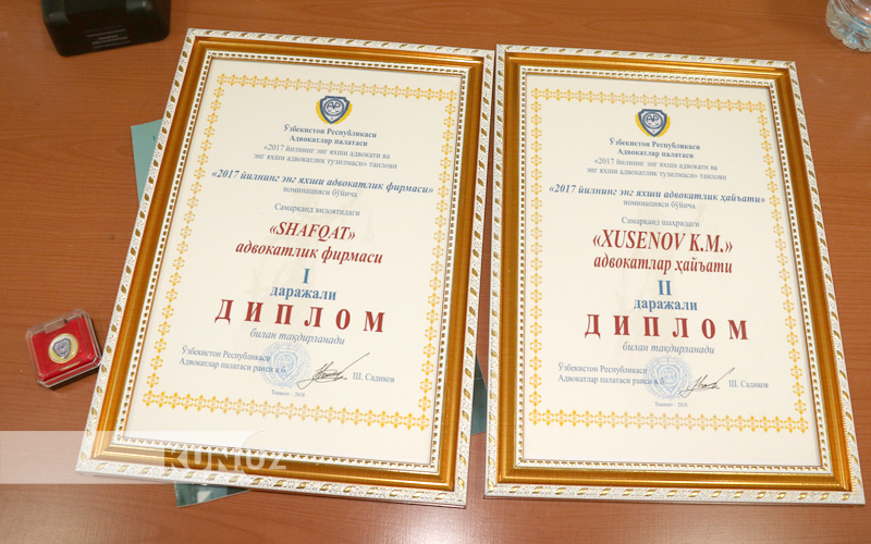 Tadbirda O‘zbekiston Respublikasi Advokatlar palatasi tomonidan o‘tkazilgan «2017 yilning eng yaxshi advokati va eng yaxshi advokatlik tuzilmasi» tanlovida viloyatning «SHAFQAT» advokatlik firmasi birinchi va Samarqand shahri «HUSENOV K.M» advokatlar hay'ati ikkinchi darajali diplom bilan taqdirlangani e'tirof etildi.