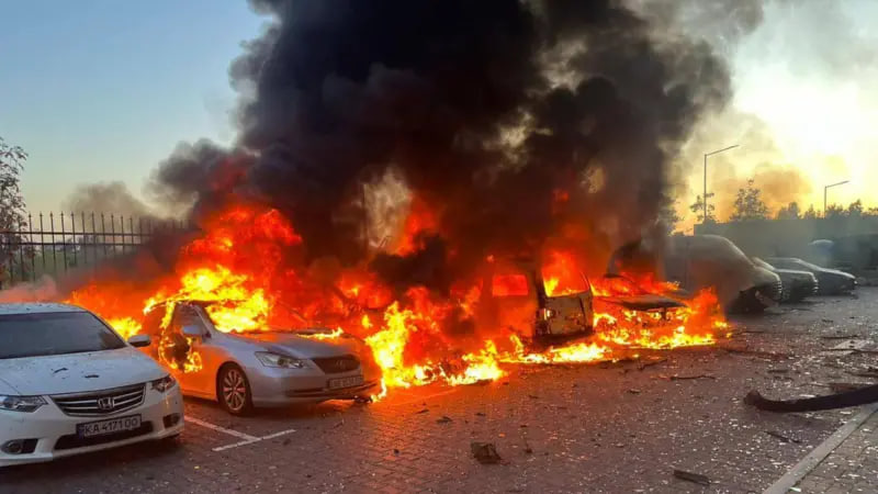 Bucha rayonida urib tushirilgan nishon bo‘laklari qulashi oqibatida beshta yengil avtomobil yonib ketgan.