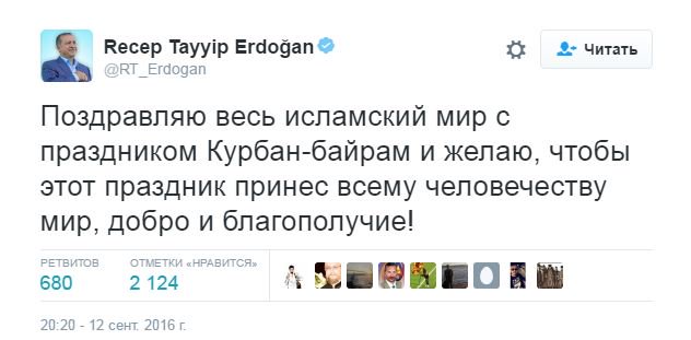 Turkiya prezidenti Rajab Toyib Erdo‘g‘an musulmonlarni Qurbon hayiti bayrami bilan muborakbod etdi. U o‘z tabrigini rasmiy tvitteri orqali 11 tilda yo‘llagan.