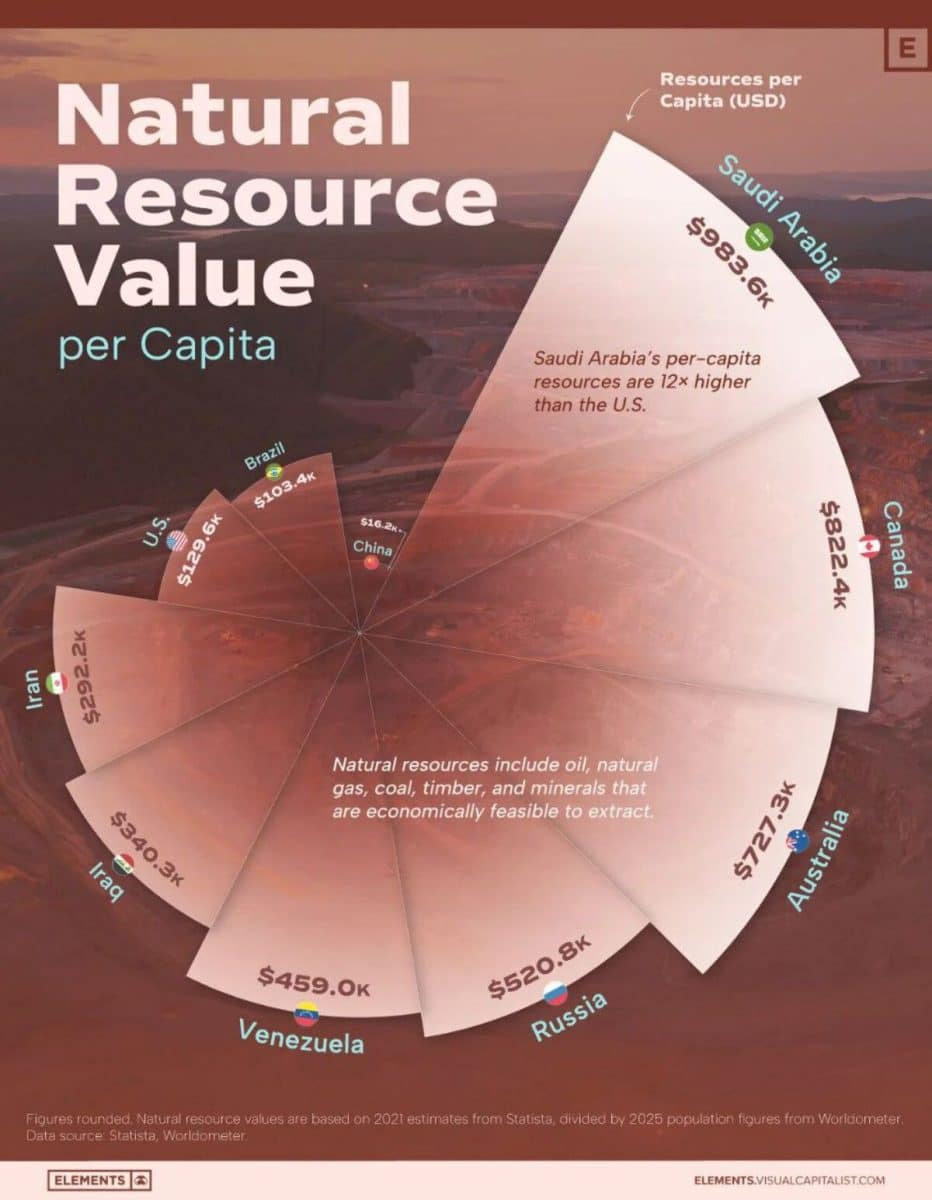 Bir necha kun oldin aholi jon boshiga to‘g‘ri keladigan tabiiy resurslar qiymati bo‘yicha yetakchi mamlakatlar ro‘yxati haqida xabar berilgandi. Reytingda neft resurslarining eng katta zaxiralaridan biriga egalik qiluvchi Saudiya Arabistoni birinchi o‘ringa joylashtirilgan. Qirollikda bir kishi hisobiga 1 mln dollar qiymatdagi tabiiy resurslar to‘g‘ri keladi. Ikkinchi va uchinchi o‘rinlarni Kanada hamda Avstraliya band etgan. Har ikki mamlakatda tabiiy boylik jon boshiga 700 ming dollardan oshadi. Kanadaning yuqori ko‘rsatkichi neft, o‘rmon zaxiralari va mineral resurslar hisobiga shakllansa, Avstraliya temir rudasi, ko‘mir va gazning katta zaxiralariga ega. Rossiya reytingda to‘rtinchi o‘rindan joy olgan. Mamlakatda bir kishi hisobiga 520 ming dollardan ortiq tabiiy resurslar to‘g‘ri keladi.