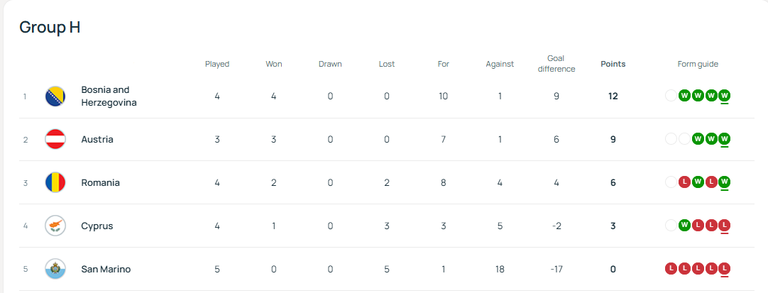 Bosniya shusiz ham favorit edi, 17-daqiqada esa mehmonlar sardori Golinuchchining «so‘nggi umid foli» tufayli son jihatdan ustunlikka erishishdi. Bolqonliklar birinchi bo‘limda behisob vaziyatlarga ega bo‘lishganiga qaramay, Taxirovichning uzoq masofdan urgan birgina goli bilan cheklanishdi. Agar kichik ofsayd bo‘lmaganida, San-Marino penaltidan hisobni tenglashtirishi ham mumkin edi. Autsayder jamoa kurashishda davom etdi, ammo 70-daqiqada Djyeko raqibni baribir taslim qildi. Shundan keyin mehmonlar darvozasiga gollar yog‘ilishi boshladi, xususan, 39 yoshli faxriy hujumchi dublni rasmiylashtirib, terma jamoa safidagi gollari sonini 70 taga yetkazib qo‘ydi. Bosniya to‘rt o‘yindan to‘rt g‘alabaga erishgan holda guruh jadvalini boshqarmoqda, ammo saralashning ikkinchi yarmi ancha qiyinroq kechadi – bosniyaliklarni avstriyaliklarga qarshi ikki og‘ir o‘yin kutmoqda.