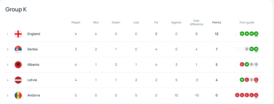 Inglizlar, xuddi serblar kabi hozircha saralash bosqichida gol o‘tkazmasdan davom etmoqda. Ammo Tuxel shogirdlari hozircha faqat Andorra (1:0, 2:0), Albaniya (2:0) va Latviya (3:0) kabi jamoalarga qarshi o‘ynagan. Keyingi turda serblarga qarshi o‘yinda jamoalardan birining (yoki ikkisining ham) seriyasiga barham berilishi ehtimoli yuqori.