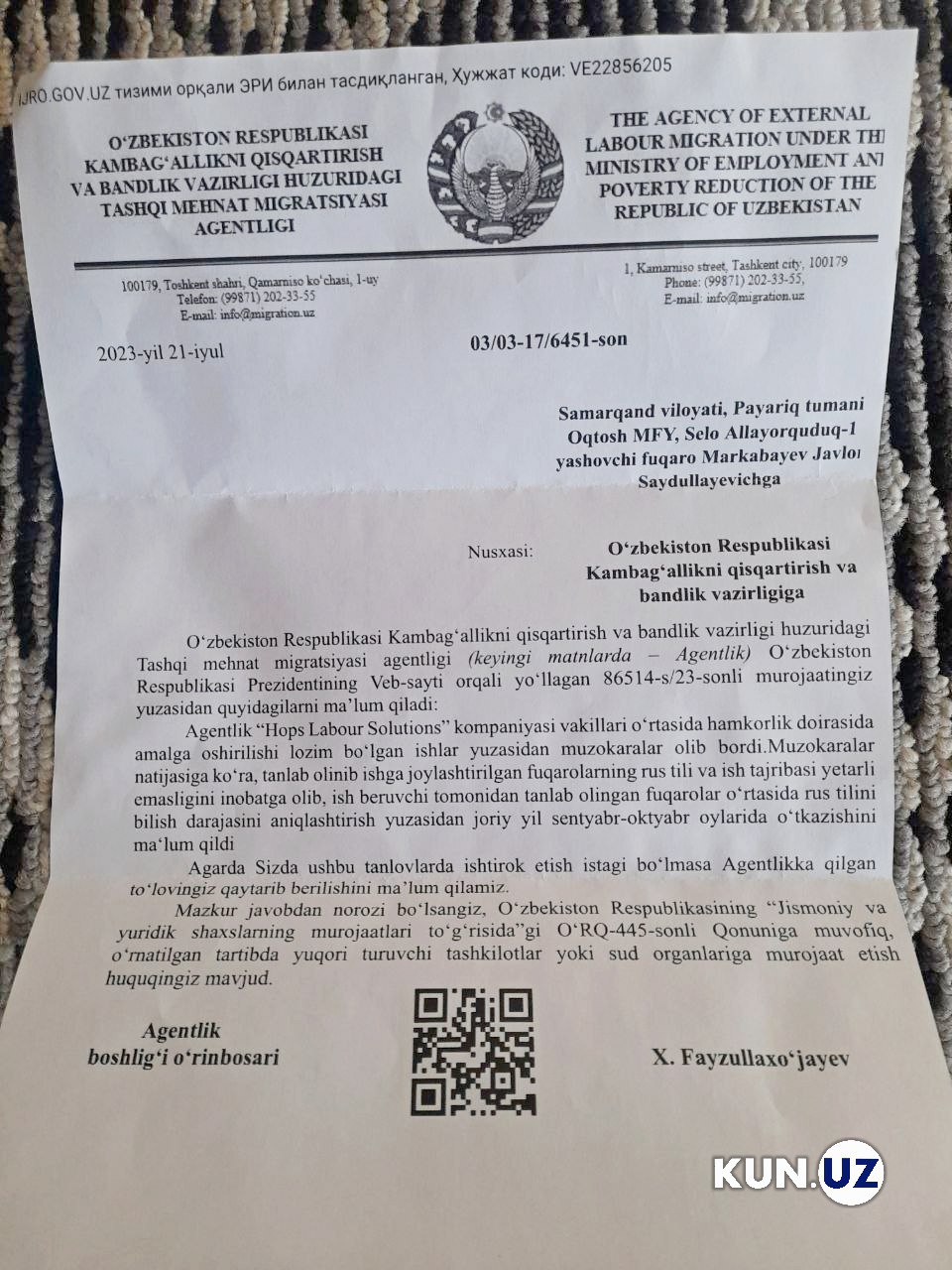 Kun.uz'da turli xususiy agentliklar tomonidan fuqarolarni xorijga jo‘natish bilan bog‘liq holatlar bir necha marta yoritilgan. Chetga chiqish evaziga katta mablag‘ to‘lab, chuv tushib qolgan fuqarolar arzi ko‘p bo‘lgan. Lekin bu safar murojaatchilar xususiy firmalar emas, Kambag‘allikni qisqartirish va bandlik vazirligi huzuridagi Tashqi mehnat migratsiyasi agentligidan norozi bo‘lmoqda.