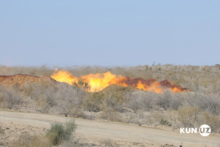 Quyi Sharqiy Berdaq konida burg‘ilangan 5-quduqdan otilib chiqayotgan gaz.
