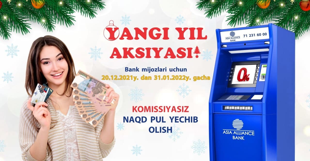 2021 yil 20 dekabrdan 2022 yil 31 yanvargacha bankning so‘mdagi karta egalariga Asia Alliance Bank o‘z bankomatlarida pul mablag‘larini komissiyasiz naqdlashtirish imkoniyatini beradi!