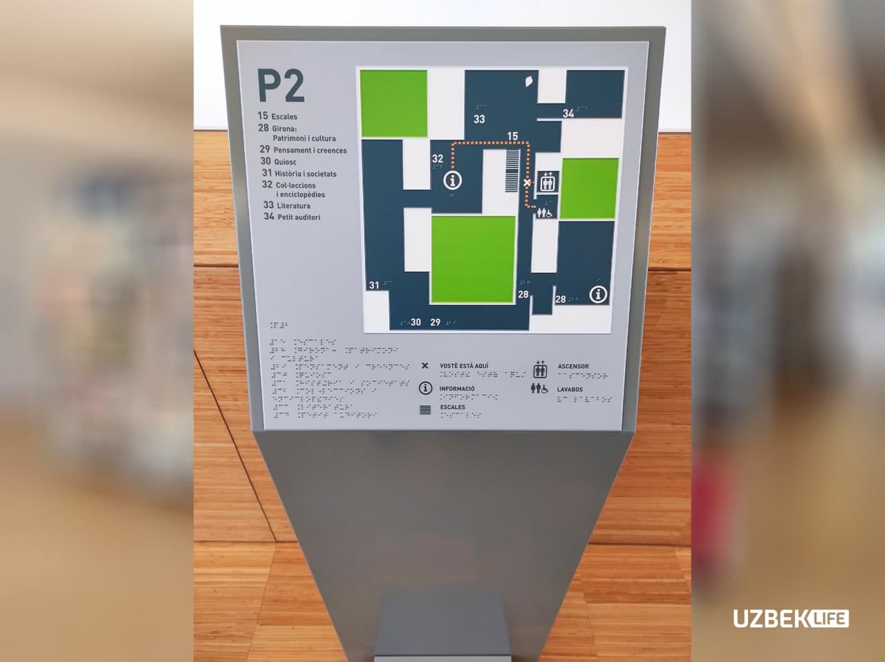 Har bir qavatda mazkur qavatning xaritasi joylashtirilgan bo‘lib, ulardan ko‘zi ojizlar ham foydalana olishi uchun xarita ma'lumotlari Brayl yozuvida ham yozilgan.
