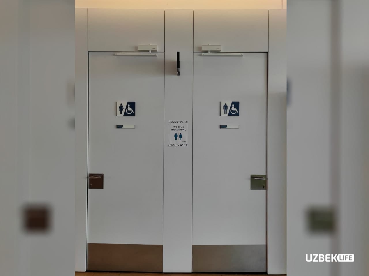 Kutubxonada foydalanish uchun hojatxonalar ham bor. Ularning eshigiga ham Brayl yozuvida yozilganini ko‘rish mumkin.