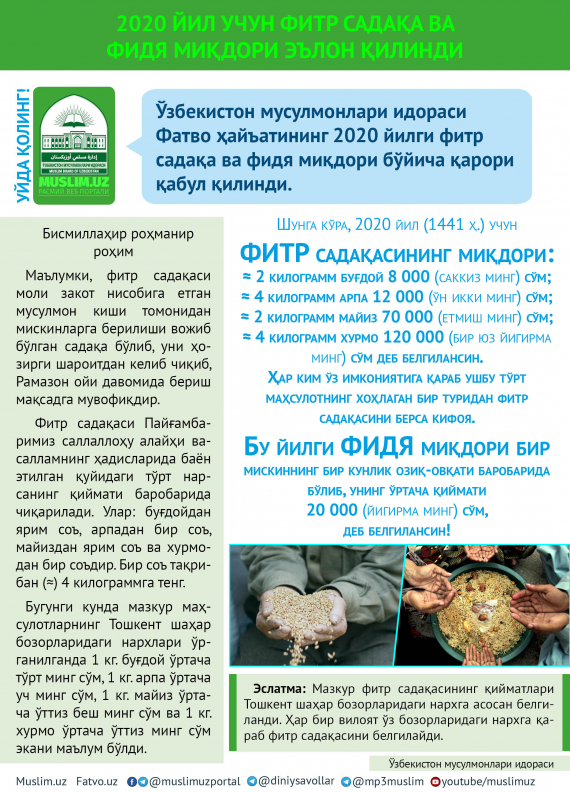 O‘zbekiston musulmonlari idorasi Fatvo hay'ati 2020 yilgi fitr sadaqa va fidya miqdorini aniqladi. Unga ko‘ra, fitr sadaqasining eng oz miqdori bir jon uchun 8 ming so‘mni, fidya 20 ming so‘mni tashkil etgan.