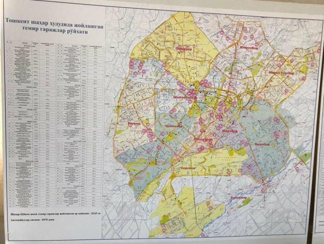 Jumladan hozirgi kunda tuman, mavze, dahalar hududida shaharsozlik va sanitar talablariga, yong‘in xavfsizligi talablariga hamda aholi xavfsizligiga javob bermaydigan tartibsiz joylashtiriligan temir beton garajlar 25,63 gektarli yer maydonlarini egallagan bo‘lib, 8470 dona avtomobillarni joylashtirish imkoniyatiga ega.