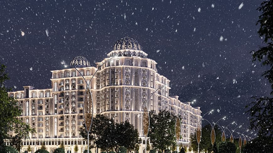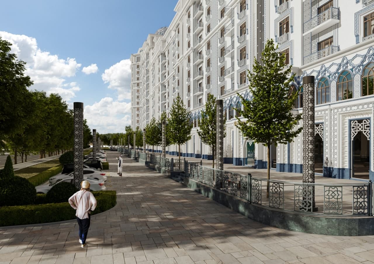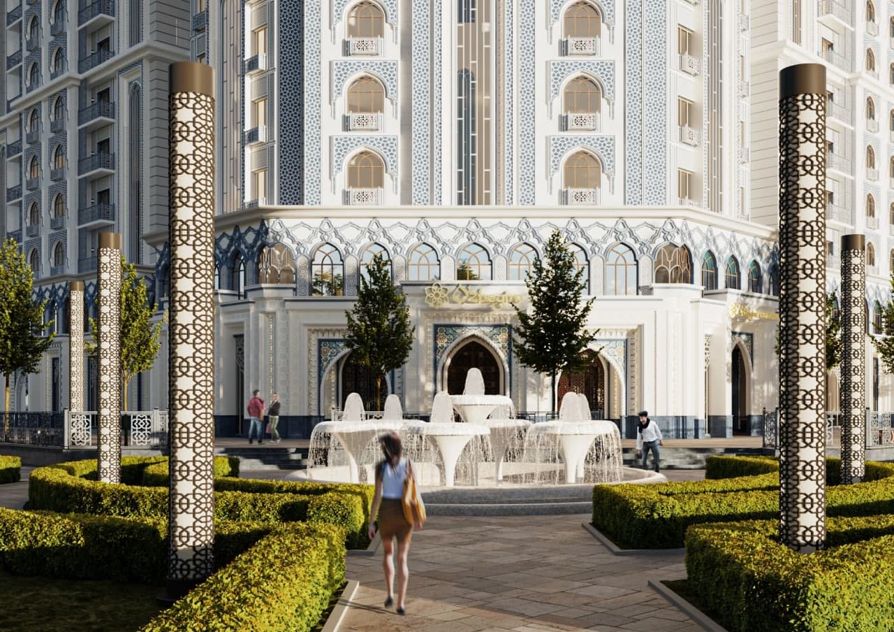 Turar joy majmuasining tashqi dizayni xalqimizning milliy ruhi va boy an'analarini o‘zida mujassam etgan bo‘lib, uyning tashqi qismida naqshinkor nafis chizgilar, girih naqshlari va rang-barang mozaikalarni ko‘rishingiz mumkin. Binoning pardoz qismi esa keramogranit, fibrobeton va marmar yordamida nafis oq va havorang ranglarda ishlangan. Majmuaning yana bir diqqatga sazovor tomoni — bu binoga haqiqiy ertaknamo chiroy bag‘ishlagan shisha gumbazlardir.