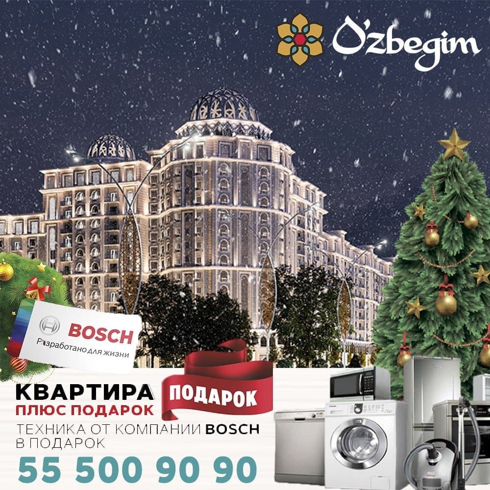 Yangi yilga ko‘rkam sovg‘alar qilish xalqimizning yaxshi odatiga aylangan. Shu boisdan faqat 2020 yil 15 dekabrdan 2021 yil 15 yanvargacha «O‘zbegim» elita turar joy majmuasidan xonadon sotib olib, sizga sovg‘a sifatida «Bosch» maishiy texnikasini xarid qilish uchun 40.000.000 so‘mdan 60.000.000 so‘mgacha sertifikatga ega bo‘lish imkoni taqdim etilmoqda.