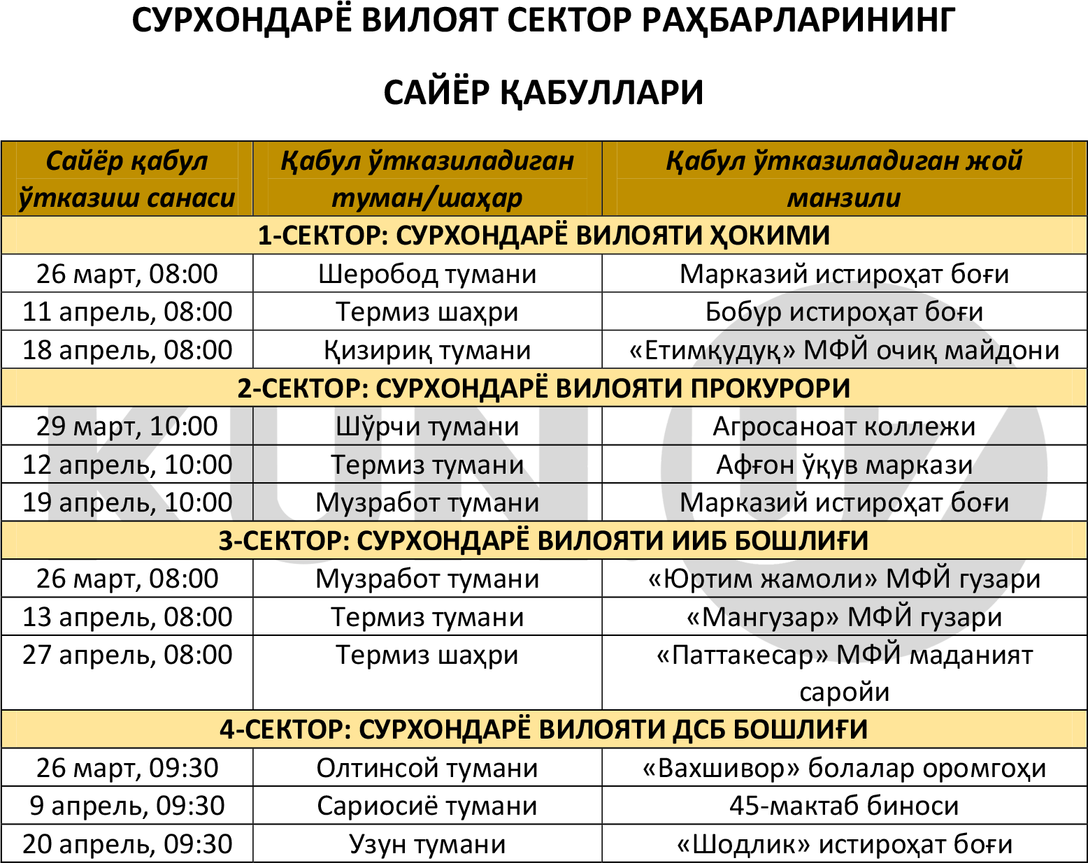 Quyida Qashqadaryo va Surxondaryo viloyatlari sektor rahbarlarining shaxsiy sayyor qabullari jadvali keltirilgan.