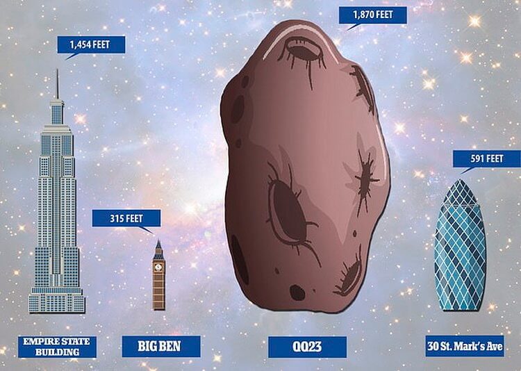 Asteroidning diametri 570 metrga yaqin bo‘lib, u Nyu-Yorkdagi Empayr-steyt-bilding osmono‘par binosidan (443 metr) ham kattaroqdir. NASAda ta'kidlanishicha, ushbu obekt sayyoramizga hech qanday xavf solmaydi.
