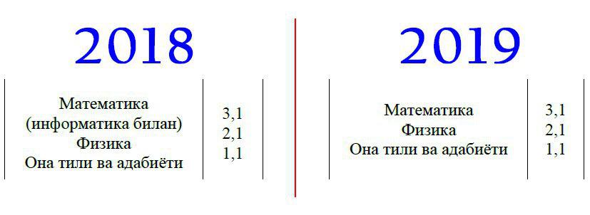 2019/2020 o‘quv yilida «Matematika» fanidan beriladigan test topshiriqlari tarkibida «Informatika» fanidan savollar bo‘lmaydi.
